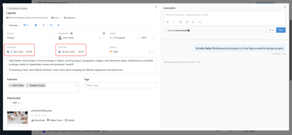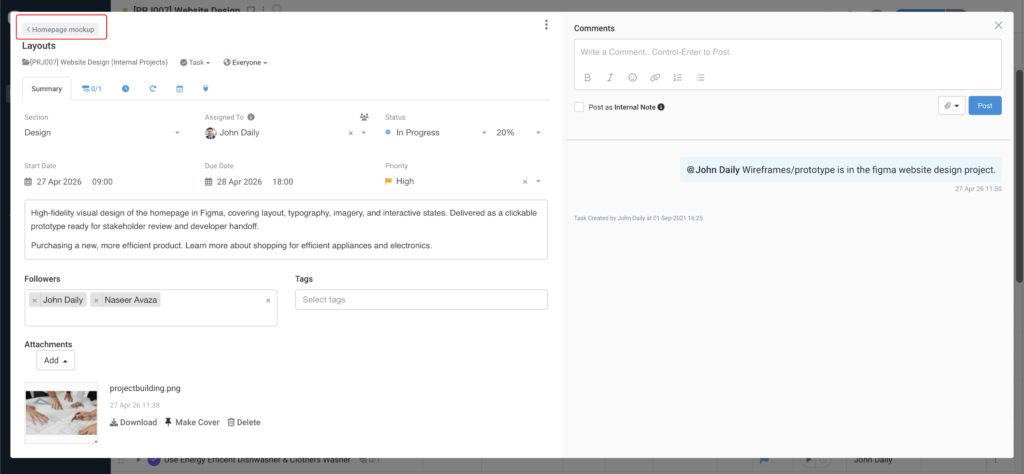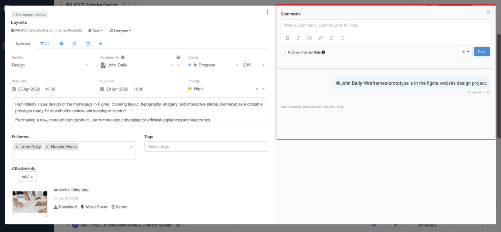 Each subtask has its own Comments panel. Discuss the work with your team, @mention colleagues to loop them in, and keep conversations attached to the exact piece of work they relate to — not buried in the parent task thread.