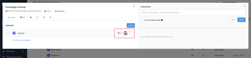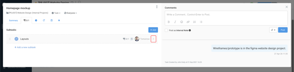 - Keep conversations focused. Use subtask comments for subtask-specific discussions. Each subtask has its own comment thread so conversations stay attached to the exact piece of work they relate to.