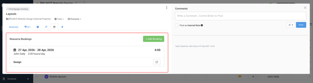 - Resource Scheduling: Bookings can be linked directly to a subtask. Schedule bars show the subtask title and the mouseover tooltip displays both the parent task name and subtask name as separate labelled fields.