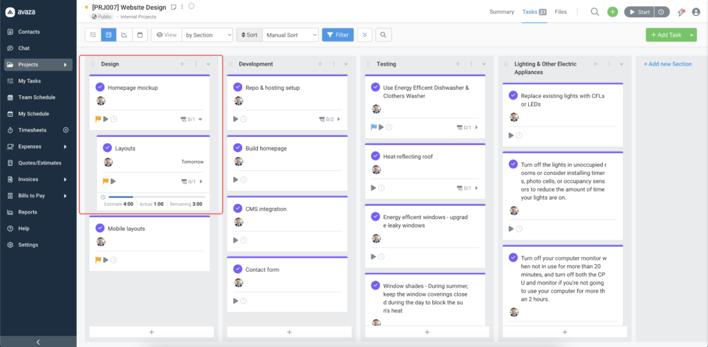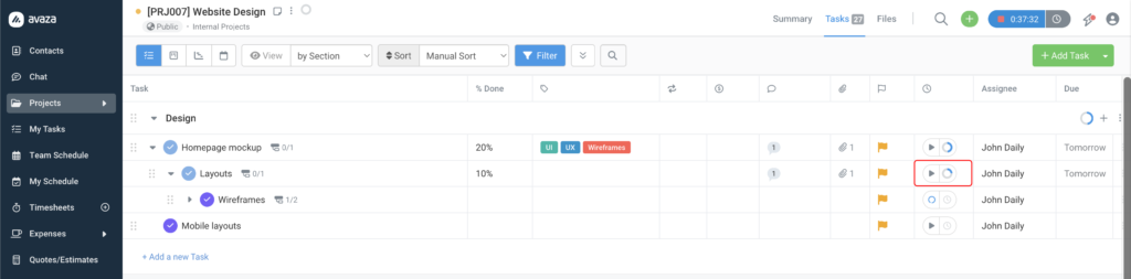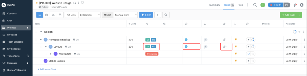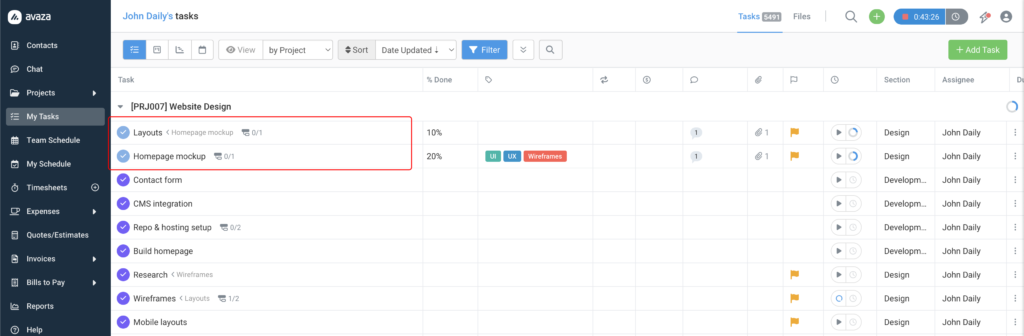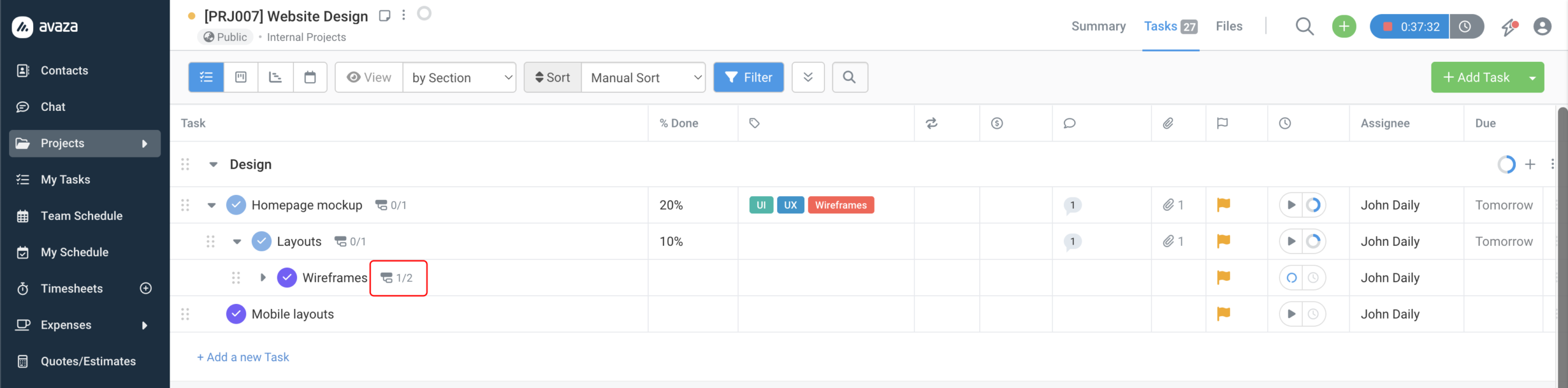 ✅ Progress is always live When a team member changes a subtask status anywhere in Avaza — from the project view, the task popup, or my tasks — the progress counter on the parent task updates immediately. |