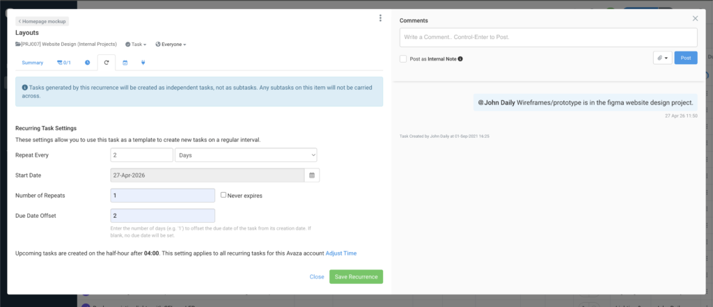 Tasks generated by a recurrence configured on a subtask are created as independent root-level tasks, and not as new subtasks. This is intentional and keeps your recurring work clean. A note on the Schedule Settings tab reminds you of this behaviour when you are in a subtask context.