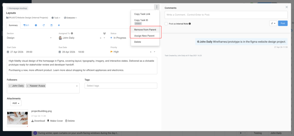 Move a subtask to a different parent task within the same project. Select the new parent from a filtered task picker and the subtask moves instantly, and both parents’ progress counts update automatically.
