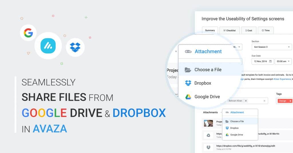 We’re happy to launch our new Google Drive & Dropbox Integrations, which allow you to attach files you already have in your cloud drives to Avaza Tasks, Task Comments, Quotes and Invoices.