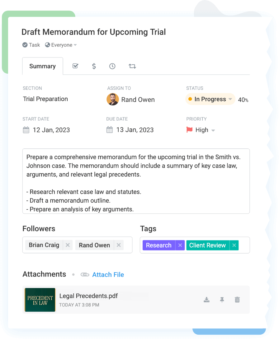 Good task management is key to completing legal work efficiently and on time. Look for software that makes it easy to create, assign, and track tasks.