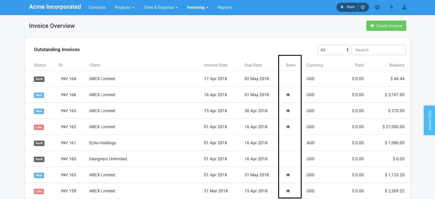 We record every online Invoice/Quote view for you. Of course, you can view the Invoices/Quotes yourself online without being tracked – just make sure you’re logged into your Avaza account!